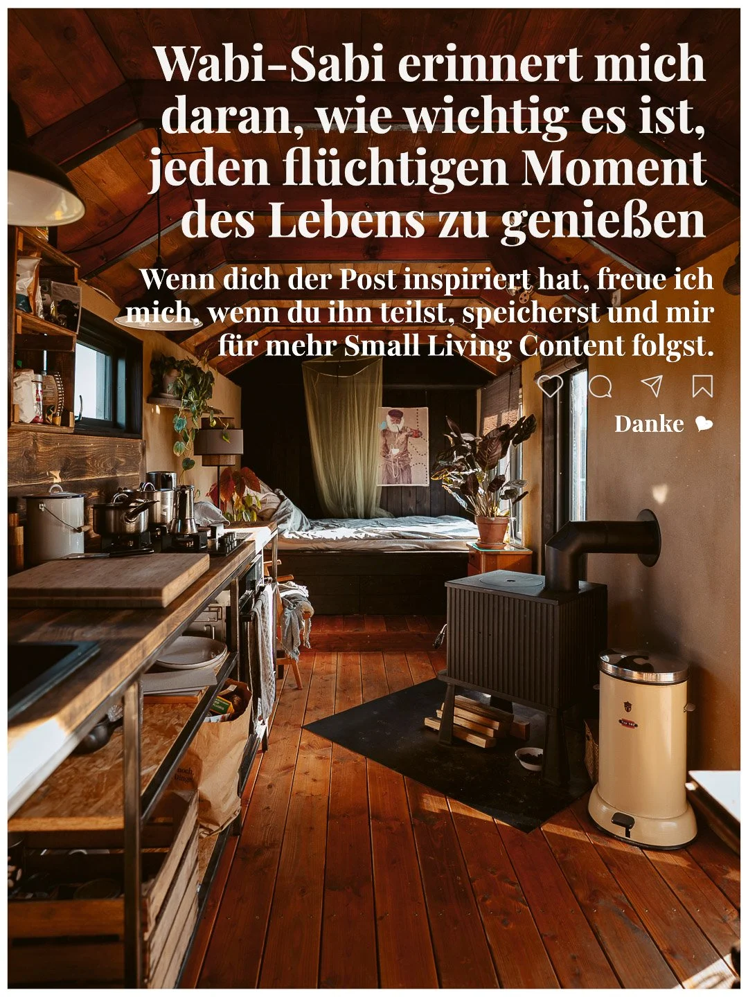 Danach habe ich ein Jahr lang mein Tiny House selbst gebaut. Mit natürlichen Materialien, mit viel Recherche, mit Respekt vor der Umwelt und mit dem Wunsch, etwas Nachhaltiges zu schaffen. Seit einem Jahr lebe ich jetzt darin – und es hat das bestätigt, was ich unterwegs schon verstanden habe. Es ging nie darum, kleiner zu wohnen. Es ging darum, bewusster zu leben. Small Living ist für mich die Entscheidung, weg vom „immer mehr“ zu gehen – und hin zu dem, was wirklich Bedeutung hat.